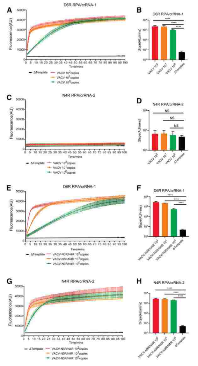 進(jìn)一步針對選擇的crRNA,分別檢測不同拷貝數的質(zhì)粒模板以及病毒DNA模板,觀(guān)察到CRISPR-Cas12a單獨檢測體系的檢測限約為108拷貝數,不同crRNA的聯(lián)合可以將檢測限提高到107拷貝數,同時(shí)實(shí)現了正痘病毒與猴痘病毒的區分。并且為了實(shí)現最低檢測限,研究團隊團隊將等溫擴增(RPA)與CRISPR-Cas12a的檢測體系聯(lián)合,最終能夠達到1個(gè)拷貝的最低檢測限,大大提高了檢測體系的靈敏度(圖2)。