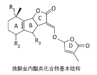 獨腳金內酯(strigolactone,SL)是新型植物激素,獨腳金內酯可以抑制植物的分枝和側芽的生長(cháng),它與生長(cháng)素和細胞分裂素協(xié)同控制植物的分枝或分蘗數量。作為一種產(chǎn)生于植物根部的類(lèi)胡蘿卜素衍生物,獨角金內酯可以促進(jìn)植物和土壤微生物的共生作用,促進(jìn)叢枝菌根(Arbuscular mycorrhiza,AM)真菌菌絲(hyphae)分枝。獨角金內酯誘導寄生植物如獨角金屬(Striga spp.)的獨腳金、列當屬(Orobanche spp.)的列當的種子萌發(fā),此外,與植物抗逆重要的信號物質(zhì)ABA在通路上有交叉,并且運輸上需要經(jīng)典的ABC transporter。獨角金內酯很可能是植物激素調控網(wǎng)絡(luò )中重要的節點(diǎn)物質(zhì),被譽(yù)為第7大類(lèi)植物激素。最初是從分析玉米根系中植物分泌的一種刺激惡性寄生雜草獨角金種子萌發(fā)的信號物質(zhì)時(shí)發(fā)現的倍半萜類(lèi)化合物,因此被稱(chēng)為獨腳金內酯。后來(lái)被證明是一種植物中普遍存在的新型植物激素,具有多種生理功能。獨腳金內酯具有刺激寄生植物種子萌發(fā)、直接或間接抑制植物側芽萌發(fā)產(chǎn)生分枝和促進(jìn)叢枝菌根真菌菌絲與寄主植物共生等諸多作用。