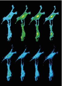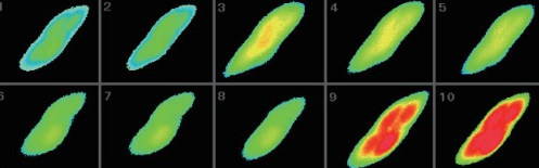 上圖是以9秒間隔連續拍攝而成。該細胞首先用50 mM KCl去極化處理 (2),然后用離子載體ionomycin 5 uM處理 (8)。該照片由熒光顯微鏡成像,再由冷CCD拍照而成。后期處理將濃度差異轉化為顏色差異,紅色表示高濃度鈣離子,藍色表示低濃度鈣離子。