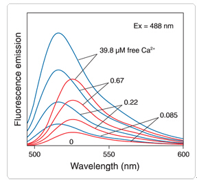 圖 Fluorescence emission spectra at equal concentrations of fluo-4 (blue) and fluo-3 (red) in solutions containing 0–39.8 μM free Ca2+.