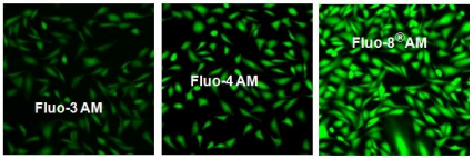圖1.將U2OS細胞以40,000個(gè)細胞/100μL/孔接種過(guò)夜,置于96孔黑色壁/透明底板中。 除去生長(cháng)培養基,將細胞分別與37μC,5%CO2培養箱中的濃度為4μM的100μLFluo-3AM,Fluo-4AM和Fluo-8?AM在HHBS中孵育。 持續1小時(shí)。 將細胞用200μLHHBS洗滌兩次,然后使用FITC通道用熒光顯微鏡(OlympusIX71)成像。