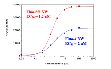 圖2.使用Screen Quest Fluo-8 NW測定試劑盒和Fluo-4 NWAssay試劑盒在HEK-293細胞中測量卡巴膽堿劑量反應。將HEK-293細胞以40,000個(gè)細胞/100μL/孔接種過(guò)夜,置于96孔黑色壁/透明底板中。除去生長(cháng)培養基,將細胞分別與100μL的Screen Quest一起孵育 ] Fluo 8-NWcalcium測定試劑盒和Fluo-4 NW試劑盒(根據制造商的說(shuō)明書(shū))在室溫下保持1小時(shí)。通過(guò)NOVOstar(BMG LabTech)添加卡巴膽堿(25μL/孔)以達到最終指示的濃度。 Fluo-8NW的EC50約為1.2 uM。