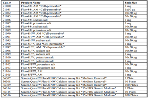 注意:非離子型洗滌劑Pluronic?F-127有時(shí)用于增加Fluo-8?AM的水溶性酯。各種Pluronic?F-127解決方案可從AAT Bioquest購買(mǎi)。