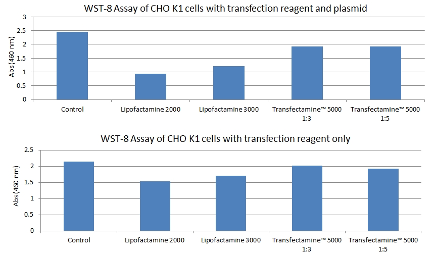 CHO-K1細胞中的細胞活力比較。使用Lipofactamine 2000,Lipofactamine 3000和Transfectamine 5000用GFP質(zhì)粒轉染一組CHO K1細胞,用與第一組相同的轉染試劑處理第二組CHO K1細胞,但不使用質(zhì)粒。48小時(shí)后,使用Cell Meter?比色WST-8細胞定量試劑盒(Cat.22770)測量每組的細胞活力。460nm處的吸光度越高,表示細胞越活。