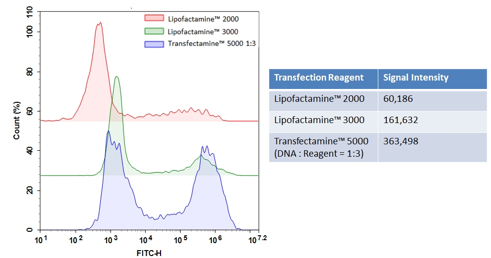 HeLa細胞中的轉染效率比較。將HeLa細胞在6孔板中培養至90%融合。將2.5 μg GFP質(zhì)粒分別用Lipofactamine 2000,Lipofactamin 3000和Transfectamine 5000轉染。通過(guò)流式細胞儀測量信號強度。