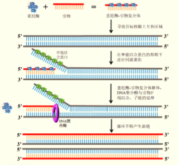 基本原理是:在常溫恒溫下,重組酶和引物形成蛋白/單鏈核苷酸的復合體 Rec/ssDNA,在輔助蛋白和單鏈結合蛋白 SSB 的幫助下,侵入雙鏈 DNA 模板;在侵入位點(diǎn)形成 D-loop 區域,并開(kāi)始對 DNA 雙鏈進(jìn)行掃描;待找到與引物互補的目的區域后,復合體 Rec/ssDNA 解體的同時(shí),聚合酶也結合到引物的 3’末端,開(kāi)始鏈的延伸,這個(gè)過(guò)程迅速高效地循環(huán),從而完成目的片段超快速擴增。