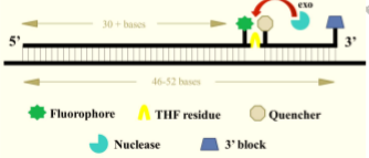 在上下游引物中間,設計一段長(cháng)度為 46-52nt 與目的片段互補的序列作為熒光探針;探針序列不與特異