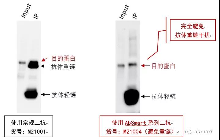 但是絕大多數一抗是沒(méi)有HRP標記的或者共價(jià)偶聯(lián)beads的,所以很多實(shí)驗室在做內源性蛋白Co-IP實(shí)驗時(shí)就會(huì )很煩惱,這時(shí)候使用避免抗體輕重鏈的AbSmart系列二抗,就可以有效地解決這類(lèi)問(wèn)題,作為內源性蛋白的Co-IP實(shí)驗的首選。