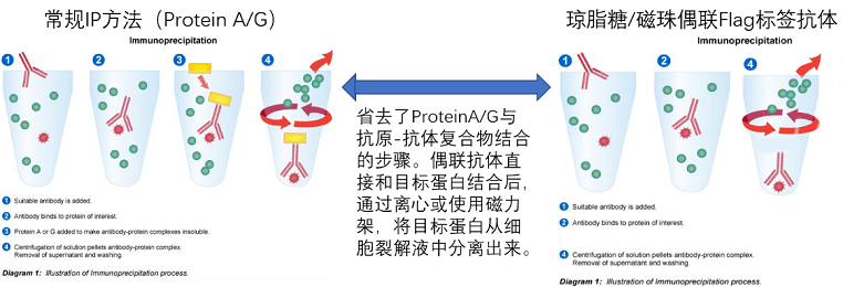 與使用Protein A/G瓊脂糖的傳統免疫沉淀(IP)方法相比,Abmart的瓊脂糖/磁珠偶聯(lián)標簽抗體,省去了Protein A/G與抗原-抗體復合物結合的步驟。偶聯(lián)抗體直接和目標蛋白結合后,通過(guò)離心或使用磁力架,將目標蛋白從細胞裂解液中分離出來(lái)。不僅讓實(shí)驗變得簡(jiǎn)單快捷,更可以避免非特異性結合,降低背景。表位標記蛋白的免疫沉淀可用于確定蛋白的細胞定位、研究翻譯后修飾或檢測標記蛋白與其它蛋白之間的相互作用。