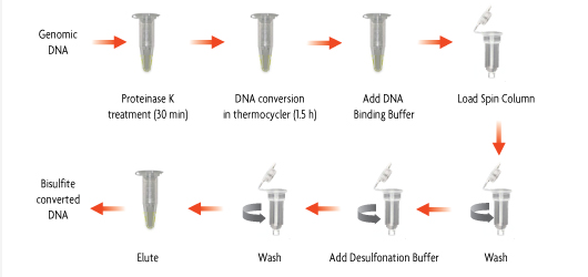 使用Bisulfite Conversion Kit,將目的DNA用蛋白酶K處理,加入重亞硫酸鹽轉化試劑和DNA變性劑,在溫度循環(huán)儀中進(jìn)行快速熱變性。經(jīng)過(guò)1.5小時(shí)的DNA轉化反應,樣品加入到試劑盒里的DNA純化柱,脫鹽后洗脫DNA,可用于PCR或其他的下游實(shí)驗。