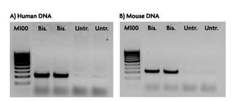使用Bisulfite Conversion Kit處理人(A)和小鼠(B)基因組DNA,處理(Bis)和未處理(Untr)的DNA分別用陽(yáng)性對照轉化特異性PCR引物進(jìn)行PCR擴增分析。陽(yáng)性對照PCR引物專(zhuān)門(mén)適用于經(jīng)重亞硫酸鹽轉化的DNA,因此會(huì )擴增出220bp的條帶,而未處理的DNA沒(méi)有擴增出相應條帶。