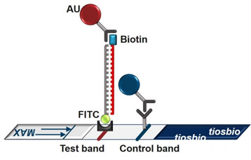 沃博生物的核酸試紙的原理也是非常類(lèi)似的,但是親和素用來(lái)偶聯(lián)了金顆粒,抗FITC抗體用來(lái)包被了T線(xiàn)。同時(shí)采用紅色膠體金顆粒對應T線(xiàn)和藍色乳膠顆粒對應C線(xiàn)。