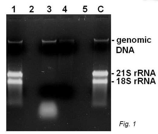 將干燥的RNase A放入反應管的樣品1、3和4。然后,RNase A 樣品用1ml的 H2O(3,4) 或RNase-ExitusPlus? (1)處理,室溫下放置5分鐘。緊接著(zhù)用1ml的無(wú)菌水清洗兩次。然后在每個(gè)管子里放入從大腸桿菌得到的RNA 5ug。將10ug的新鮮分裝RNase A添加到管4中,所有管在37° c孵育30分鐘。5ug未處理的從大腸桿菌得到的RNA作為對照(C)。最后,加入緩沖液和將樣本加入 1%瓊脂糖凝膠電泳檢測。