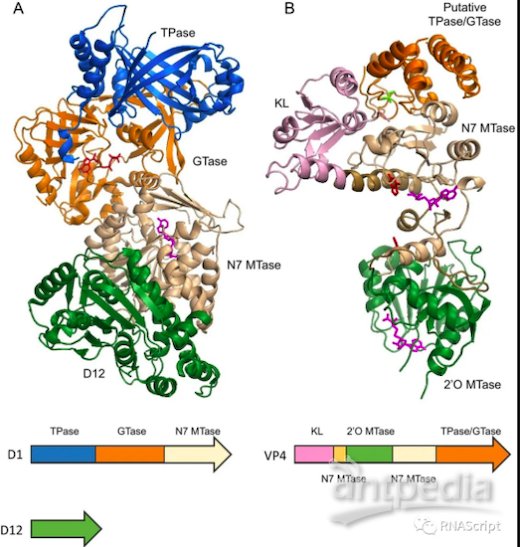 一些病毒加帽酶整合了RNA加帽所有必要酶活性(多功能加帽酶),以在單個(gè)多肽中生成Cap0或Cap1。痘病毒加帽酶和藍舌病病毒加帽酶就是這樣兩個(gè)例子,它們的全長(cháng)蛋白質(zhì)結構已經(jīng)被解析(圖4):