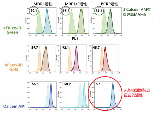 圖1:對三種主要ABC轉運蛋白的活性進(jìn)行檢測。使用EFLUXX -ID Green(上)、Gold(中)或Calcein AM(下)染料,通過(guò)流式細胞術(shù)評估CHO K1細胞中ABC轉運蛋白的活性。與未處理的細胞相比,用ABC轉運蛋白特異性抑制劑(圖中陰影部分)處理可誘導染料保留在細胞內(圖中實(shí)線(xiàn)部分)。平均熒光強度(MFI)的差異表明了對應蛋白的活性,在圖中通過(guò)多藥耐藥性活性因子值(MAF)進(jìn)行表征。更高的MAF值表明EFLUXX-ID染料對抑制劑有著(zhù)良好的特異性。而Calcein AM染料的低MAF值表明其(常用的MDR檢測探針)無(wú)法檢測BCRP活性。