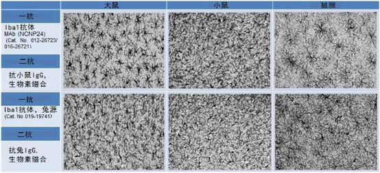 →使用抗Iba1,單克隆抗體(Wako目錄號012-26723)小膠質(zhì)細胞的定位信號清晰,與抗Iba1,兔多克隆抗體的效果相同(Wako目錄號019-19741 019-19741)