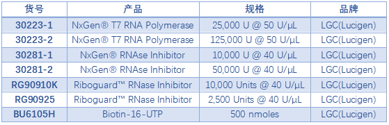 T7 RNA聚合酶是一種高度特異性識別T7啟動(dòng)子序列的DNA依賴(lài)的5'→3'RNA聚合酶。LGC(Lucigen)提供用于體外轉錄的高活性、高性?xún)r(jià)比的NxGen? T7 RNA Polymerase,進(jìn)口的品質(zhì),國產(chǎn)的價(jià)格!此外還提供體外轉錄試劑盒以及RNA合成標記原料Biotin-16-UTP。