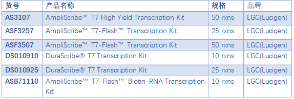 使用AmpliScribe? T7-Flash? Transcription Kit可在30分鐘生產(chǎn)高產(chǎn)量RNA,用于CRISPR(gRNA),體外翻譯,RNA干擾,結構研究,反義研究和雜交檢測(RNA探針)等應用。