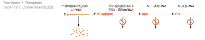 Terminator Exonuclease是一種5'→ 3'進(jìn)行性核酸外切酶,可降解帶有5‘單磷酸的RNA。它不會(huì )降解具有5'三磷酸、5'-帽結構(例如大多數真核mRNA帶有的5'-帽結構)或5'OH的RNA。它也消化帶有5'單磷酸的DNA。該酶不受蛋白形式的RNase抑制劑的抑制。
