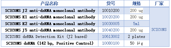 SCICONS(匈牙利)作為全球唯一一家dsRNA抗體供應商,提供J2、J5、K1、K2四種anti-dsRNA單克隆抗體,其中J2抗體是dsRNA檢測的金標準??梢杂糜贓LISA、免疫熒光、流式、免疫沉淀等實(shí)驗,參考文獻700余篇。值得一提的是,Moderna的dsRNA污染檢測方法便是使用SCICONS的抗體。