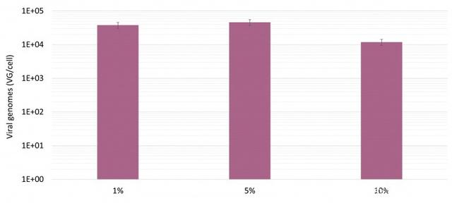 通常,轉染復合體積占最終細胞培養體積的10%,這在擴大生產(chǎn)規模時(shí)可能會(huì )導致技術(shù)限制。FectoVIR-AAV經(jīng)過(guò)優(yōu)化,可將絡(luò )合量降低至1%,從而有助于制備用于大規模生產(chǎn)的轉染復合物。例如,對于200 L的細胞懸液體積,轉染復合體積可以從20 L (10%)降至2 L (1%)進(jìn)行優(yōu)化。