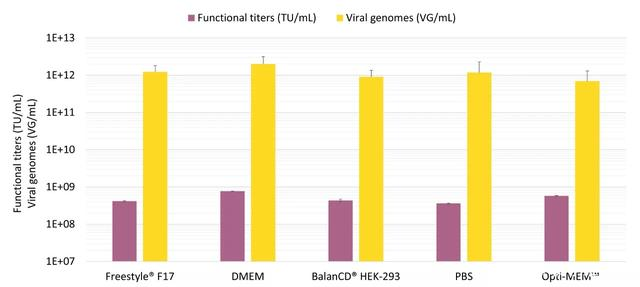 合成細胞培養基的選擇特定于每個(gè)rAAV制造平臺。FectoVIR-AAV/DNA復合物的效率已在不同的市售合成復合介質(zhì)中進(jìn)行了全面測試,并且效價(jià)收率在各種測試介質(zhì)中的變化很小。