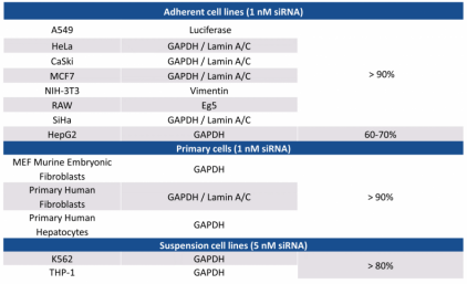 對多數貼壁細胞或原代細胞,1 nM siRNA能夠達到超過(guò)90%的基因沉默。對于懸浮細胞,使用5 nM siRNA依然能達到80%的沉默效率。