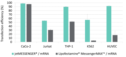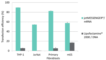 jetMESSENGER? 在難轉染細胞中非常高效,相比于其他mRNA轉染試劑