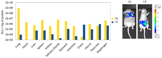 in vivo-jetPEI? 可在任何器官或組織中,通過(guò)基因過(guò)表達或者基因抑制的方法進(jìn)行基因功能研究。它可以通過(guò)全身和局部注射目標多種器官。注射途徑在很大程度上決定了靶器官。例如,在靜脈注射時(shí), in vivo-jetPEI?遞送的 DNA 主要在肺部表達,也在肝臟、胰腺、腎臟、脾臟、膀胱、心臟和動(dòng)脈中表達。而腹腔注射,基因在卵巢、胰腺、膈肌、子宮和胃中表達 (Fig. 1)。為了實(shí)現器官特異性基因表達,可以結合細胞特異性啟動(dòng)子和局部注射途徑,達到在特定器官/組織中的基因表達。