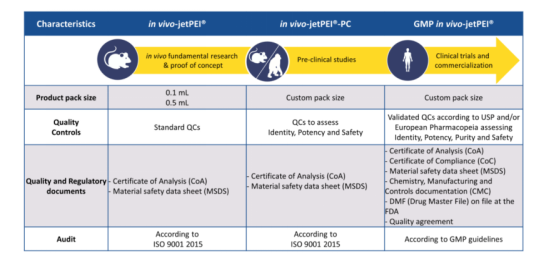 in vivo-jetPEI?有研發(fā)級用于基礎研究和實(shí)驗驗證,PC級可用于臨床前生物分布和毒理研究,GMP級 in vivo-jetPEI?是最高質(zhì)量等級的,符合人體臨床試驗的質(zhì)量要求。