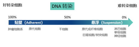通常,貼壁細胞(如腫瘤細胞系等)比懸浮細胞(如淋巴細胞等)容易轉染;增殖速度快的細胞比處于靜止期的細胞容易轉染;而細胞系比原代細胞更易轉染。