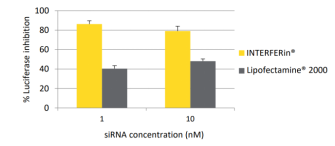 一些文獻表明轉染低濃度的siRNA能夠避免脫靶效應。確實(shí),當轉染高濃度siRNA時(shí),會(huì )觀(guān)察到這些非特異性的副作用。因此通過(guò)使用盡可能少的siRNA可以提高實(shí)驗數據的可靠性。INTERFERin? 專(zhuān)為此而設計:使用低濃度siRNA達到高效率基因沉默。