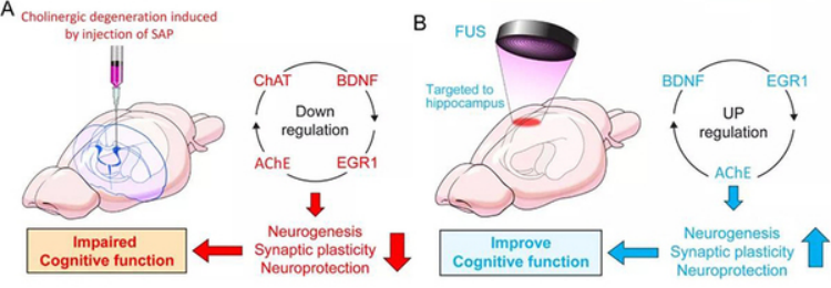 為了研究聚焦超聲(FUS)對老年癡呆癥膽堿能神經(jīng)元變性大鼠模型中海馬神經(jīng)發(fā)生的影響,作者通過(guò)向側腦室注射192-IgG-SAP誘導膽堿能神經(jīng)元死亡(如下圖),導致ChAT、BDNF、EGR1和AChE的表達水平下調,影響了海馬神經(jīng)的發(fā)生、突觸可塑性和神經(jīng)保護功能,進(jìn)而使大鼠認知功能受損,制作阿爾茲海默癥大鼠模型。在后續的研究中作者又針對雙側海馬進(jìn)行FUS治療,通過(guò)上調BDNF,EGR1和AChE的表達改善了認知功能。