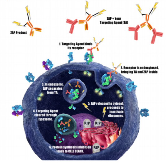 ZAP產(chǎn)品與用戶(hù)提供的一抗結合,形成二級偶聯(lián)毒素,再靶向細胞表面的抗原,從而篩選真正起作用的靶向物;