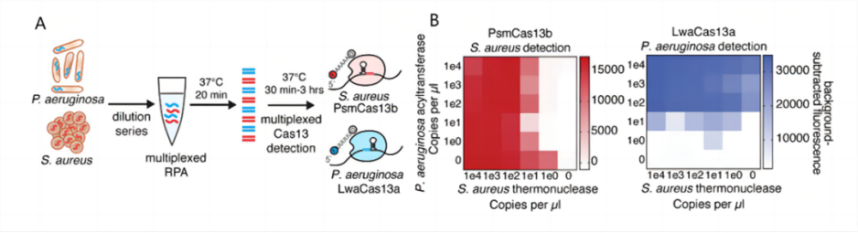 Gootenberg[8]等基于重組酶聚合酶擴增技術(shù) (Recombinase Polymerase Amplification, RPA)和CRISPR/Cas13建立了RPA-CRISPR/Cas-雙重熒光檢測系統。通過(guò)多重RPA擴增,再將擴增產(chǎn)物轉錄得到RNA靶標,兩種不同的RNA靶標分別與Cas13a/crRNA、Cas13b/crRNA結合并激活對應Cas13蛋白的反式剪切活性。根據Cas13蛋白反式剪切探針的偏好性,采取Cas13a剪切poly U探針,Cas13b剪切poly A探針,兩種探針?lè )謩e標記不同的熒光基團,從而通過(guò)檢測兩種熒光信號強度的變化,實(shí)現對金黃色葡萄球菌和銅綠假單胞菌的同時(shí)檢測。