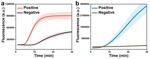 研究人員選取了猴痘病毒的B6R和F3L基因作為檢測的靶標,并針對這兩個(gè)基因篩選了多對RPA引物。盡管如此,在對模擬樣本進(jìn)行獨立RPA擴增測試的過(guò)程中仍出現了較多的非特異性擴增,這與RPA方法的擴增原理相關(guān)。為了解決檢測過(guò)程中非特異性擴增的問(wèn)題,研究人員嘗試將CRISPR-Cas12a核酸檢測技術(shù)與RPA方法相結合,并分析相同的樣品。結果證明該方法使檢測的特異性得到了明顯的提升,CRISPR-Cas12a識別了RPA擴增子的特定序列,并將其與非特異性擴增的產(chǎn)物區分開(kāi)來(lái)(圖2)。
