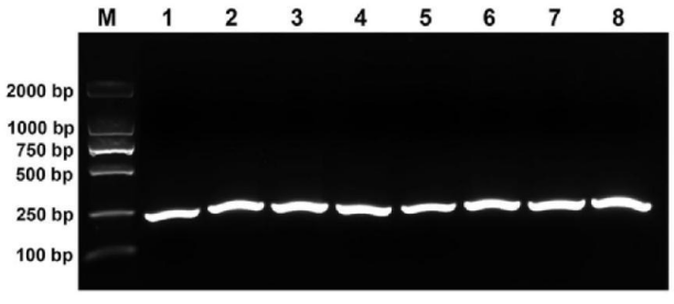 對于水稻干尖線(xiàn)蟲(chóng)的核酸提取,作者采用的是改進(jìn)的貝爾曼漏斗法。而后對提取的核酸進(jìn)行RPA擴增。為達到檢測性能最佳,首先對RPA引物進(jìn)行評估,在25°C、28°C、32°C、35°C、37°C、39°C、42°C和45°C不同溫度下對含有線(xiàn)蟲(chóng)目標片段的重組質(zhì)粒進(jìn)行擴增,所有溫度下均能擴增,但為了方便實(shí)驗操作和對降低設備的要求,后續RPA反應選擇37°C,該溫度也有利于Cas12a活性的發(fā)揮(圖2)。