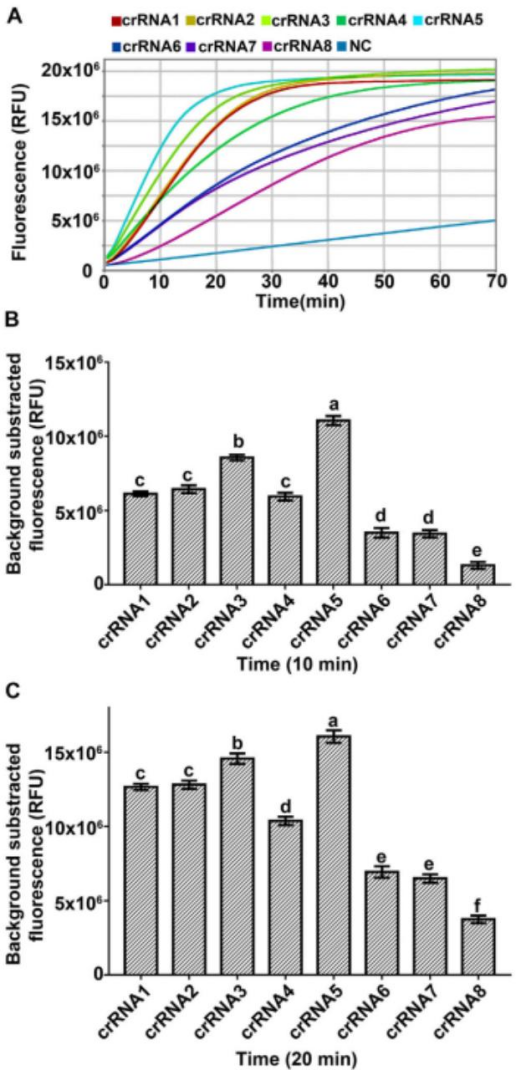 緊接著(zhù),作者選用ToloBio提供的的LbCas12a(#32108-03,Tolo Biotech, Anhui, China),利用該酶的反式切割活性建立了CRISPR檢測體系。crRNA是影響Cas12a反式切割活性的主要因素,所以作者針對水稻干尖線(xiàn)蟲(chóng)目標片段設計了8條crRNA進(jìn)行crRNA的篩選,最終選擇高活性的crRNA5用于后續檢測,該crRNA5可在20分鐘時(shí)間內獲得理想的結果(圖3)。