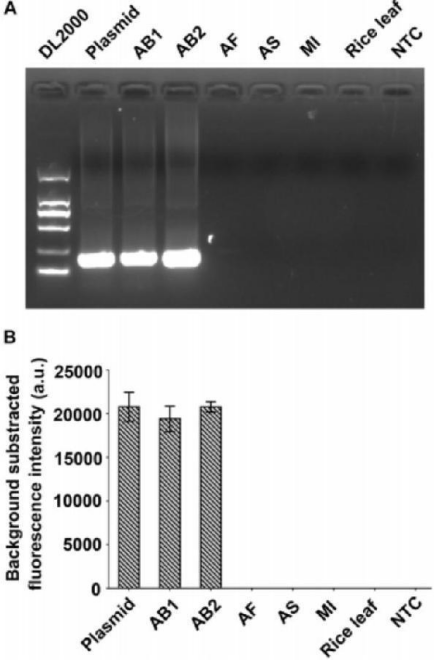 初步建立 RPA-Cas12a-Ab檢測體系后,研究者們測試了該體系的特異性。結果表明,RPA-Cas12a-Ab檢測體系對2例水稻干尖線(xiàn)蟲(chóng)樣本(AB1、AB2)和含水稻干尖線(xiàn)蟲(chóng)目標片段的質(zhì)粒檢測呈陽(yáng)性;而對3例非水稻干尖線(xiàn)蟲(chóng)樣本(AF、AS、MI),以及水稻葉片基因組樣本(Rice Leaf)均無(wú)擴增,也無(wú)CRISPR檢切信號,結果為陰性。證明了RPA-Cas12a-Ab檢測方法的特異性(圖4)。