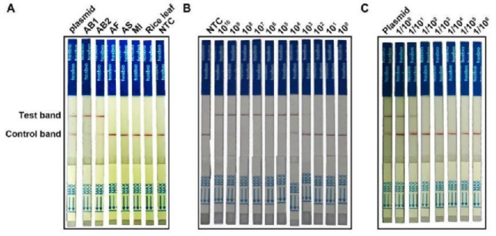 為便于現場(chǎng)檢測及方便用戶(hù),作者將RPA-Cas12a與LFA技術(shù)相結合,建立了RPA-Cas12a-Ab-LFA檢測方案。同樣地,作者對此簡(jiǎn)易化檢測系統進(jìn)行了特異性和靈敏度的驗證。水稻干尖線(xiàn)蟲(chóng)樣品(AB1和AB2)顯示出與陽(yáng)性對照相似的清晰條帶,非水稻干尖線(xiàn)蟲(chóng)樣品(AF,AS和MI)未觀(guān)察到交叉反應,這也證明了RPA-Cas12a-Ab-LFA檢測體系的特異性。使用含有水稻干尖線(xiàn)蟲(chóng)目標片段的重組質(zhì)粒pUC57-18S和提取的水稻干尖線(xiàn)蟲(chóng)的基因組DNA進(jìn)行10倍梯度稀液后測試靈敏度,結果表明,該系統可檢測到1000 copies/μL的含目標片段質(zhì)粒樣本,或是10-1稀釋的水稻干尖線(xiàn)蟲(chóng)基因組DNA提取樣本(圖6)。