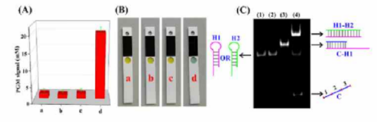 作者在不同的條件下,研究了該方案的可行性。如圖2A所示,沒(méi)有目標Kan,C鏈在DNA1-DNA2雙鏈中被阻斷,H1和H2的組裝無(wú)法發(fā)生(直方圖a)。如果傳感系統中不存在H1(直方圖b),與直方圖a相比,血糖讀數沒(méi)有明顯變化。在缺少Cas12a的情況下(直方圖c), Cas12a介導的裂解功能無(wú)法發(fā)揮作用,血糖儀信號可以忽略不計。正如預期的那樣,只有當檢測系統中所有組分都完整時(shí),才能產(chǎn)生血糖儀讀數(直方圖d)。