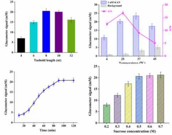 為了獲得更好的用于Kan檢測的血糖儀傳感器的分析結果,對C鏈的支點(diǎn)(結構域1)長(cháng)度、體系的反應溫度、與Cas12a的反應時(shí)間以及蔗糖濃度等實(shí)驗參數進(jìn)行了優(yōu)化(圖3)。首先對C鏈的支點(diǎn)長(cháng)度進(jìn)行優(yōu)化,選擇最佳長(cháng)度8 nt,過(guò)短的話(huà)會(huì )影響鏈置換??紤]到最佳的信噪比(S/N),選擇25℃作為最佳反應溫度。90 min內血糖儀信號隨著(zhù)反應時(shí)間的增加而增加,90 min后響應信號停止增加,因此,Cas12a的最佳反應時(shí)間為90 min。進(jìn)一步優(yōu)化了蔗糖濃度,0.2-0.5 M信號值增加,0.5 M以后基本達到平臺期,因此最佳濃度為0.5 M (圖3)。