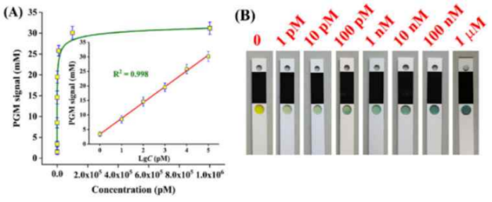 在最佳實(shí)驗條件下,研究了Kan濃度與血糖儀讀數的關(guān)系。如圖4A所示,隨著(zhù)Kan濃度的增加,血糖儀讀數逐漸增加。同時(shí)記錄血糖儀試紙條圓形控制窗口的顏色變化情況,隨著(zhù)Kan濃度的增加,條帶的顏色逐漸由黃色變?yōu)榫G色(圖4B)。與空白樣品相比,1 pM Kan可以產(chǎn)生明顯的顏色變化,這可以定義為傳感系統的檢測限。如此高的靈敏度可歸因于發(fā)夾DNA的循環(huán)組裝過(guò)程,Cas12a的切割能力以及轉化酶的多重轉化效率。