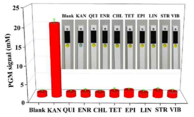 以QUI、ENR、CHL、TET、EPI、LIN、STR、VIB等非靶標抗生素作為干擾分子,檢測血糖傳感器的特異性。Kan濃度為1 nM,對照抗生素濃度為100 nM。如圖5所示,在Kan存在下,試紙條顏色為綠色,血糖儀信號高。在干擾抗生素存在的情況下,試紙的顏色仍為黃色,與空白樣品幾乎相同。這些結果表明,對照分子不干擾生物傳感器的分析性能。該傳感系統優(yōu)異的特異性可歸因于適配體對Kan的特異性識別。