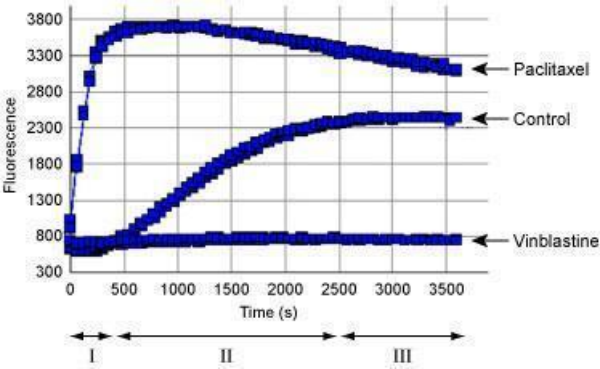 圖1. 使用基于熒光分析法的微管蛋白聚合檢測試劑盒(BK011P)進(jìn)行。Tubulin分別與Paclitaxel和Vinblastine反應,且設置另一個(gè)單獨孵育Tubulin作為對照組。每個(gè)條件都進(jìn)行了重復的測試。聚合反應在360 nm下激發(fā),420 nm發(fā)射。實(shí)驗結果表現為聚合曲線(xiàn),該曲線(xiàn)將聚合過(guò)程分為3個(gè)階段:成核期,生長(cháng)期,和穩態(tài)期。