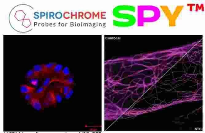 Spirochrome的活細胞染色探針可通過(guò)細胞膜的物質(zhì),并可以對微管蛋白進(jìn)行染色。與SiR和SiR700染料相比,SPY?具有亮度更高、細胞毒性更低的特點(diǎn),無(wú)需基因操作或過(guò)表達即可對微管進(jìn)行染色