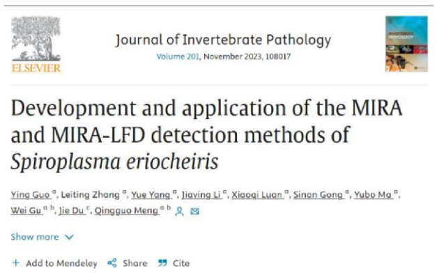 南京師范大學(xué)海洋科學(xué)與工程學(xué)院孟慶國課題組研究了MIRA 和 MIRA-LFD 螺原體檢測方法的開(kāi)發(fā)和應用。相關(guān)研究成果以“Development and application of the MIRA and MIRA-LFD detection methods of Spiroplasma eriocheiris”為題在國際學(xué)術(shù)期刊journal of invertebrate pathology在線(xiàn)發(fā)表,期刊影響因子為3.4。