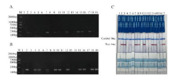 最后使用優(yōu)化過(guò)的MIRA和MIRA-LFD 反應體系、反應引物、反應條件,針對隨機提取的17個(gè)樣本DNA以及陽(yáng)性對照與陰性對照分別進(jìn)行了中華絨螯蟹螺原體MIRA,MIRA-LFD和PCR檢測. 通過(guò)分析比對不同檢測方法的結果,判斷本實(shí)驗所建立的中華絨螯蟹螺原體MIRA和MIRA-LFD檢測方法可行。