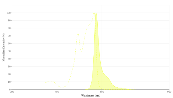 PE(藻紅蛋白,Phycoerythrin)是從紅藻中分離出來(lái)的240 kDa 藻膽蛋白。它發(fā)出強烈的黃橙色熒光(比熒光素亮約 25 倍),摩爾消光系數為 1,960,000 cm -1 M -1,熒光量子產(chǎn)率為 0.84。天然狀態(tài)下的 PE 熒光光譜具有三個(gè)吸光度峰,一個(gè)主吸光度峰位于 565 nm,兩個(gè)次級吸光度峰位于 496 nm 和 545 nm,一個(gè)發(fā)射峰位于 574 nm。這三個(gè)吸光度峰提高了與配備藍色 (488 nm)、綠色 (532 nm) 和黃色激光 (561-568 nm) 的成像儀器的兼容性。