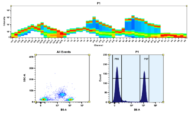 圖3.頂部)使用4激光光譜流式細胞儀生成光譜圖。使用空間偏移激光器(355 nm、405 nm、488 nm 和 640 nm)創(chuàng )建四個(gè)不同的發(fā)射曲線(xiàn),然后組合起來(lái)產(chǎn)生整體光譜特征。